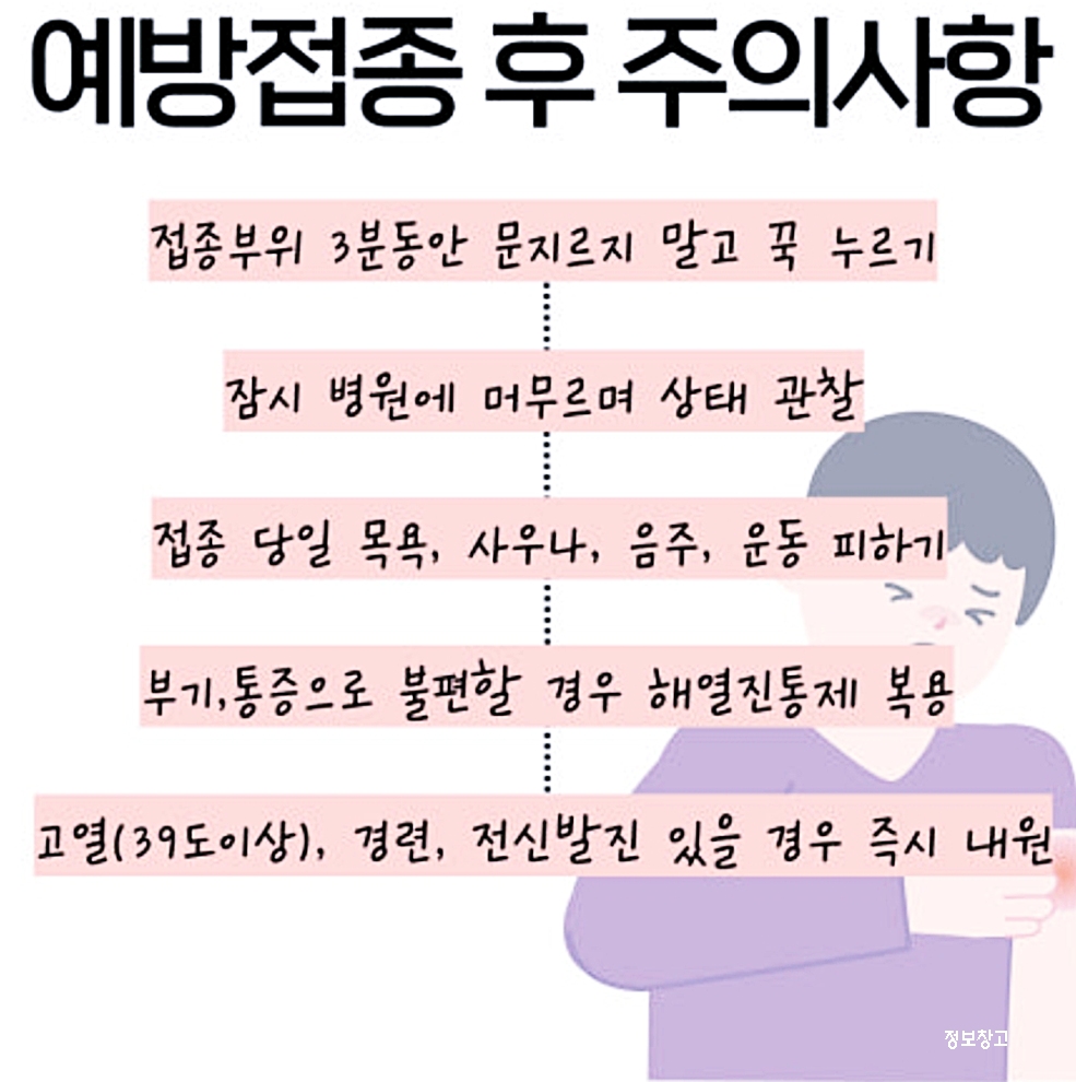 - 접종 후 하루 이틀은 무리한 활동, 음주 피하기