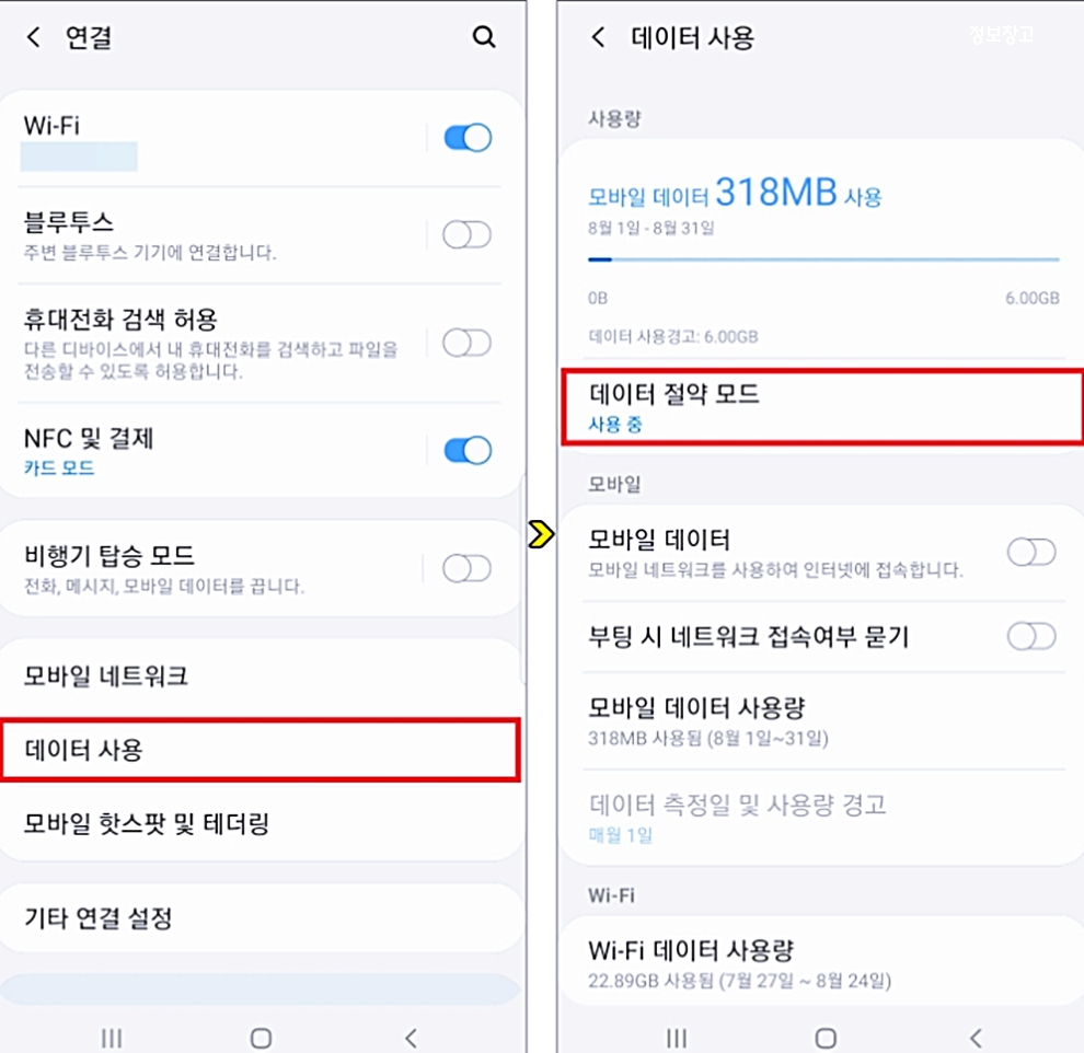 설정 → 연결 → 데이터 사용 → 데이터 절약 모드 → OFF