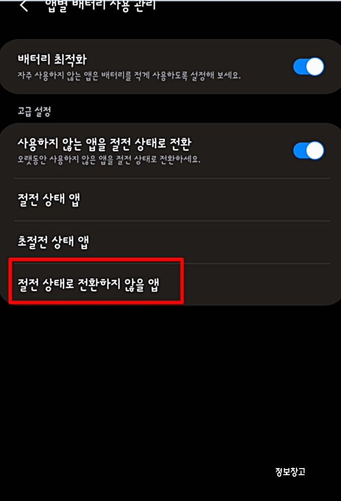 문제 앱(카카오톡, 문자, 배민 등)이 절전 목록에 있다면