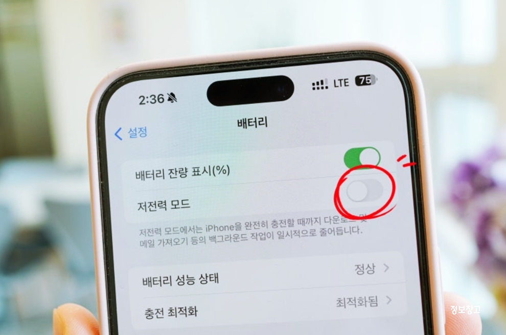 에서는 저전력 모드를 켜두면 체감되는 차이가 큽니다.