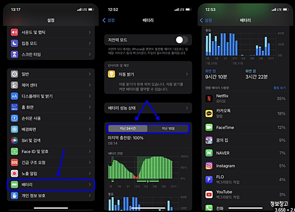 이렇게 하루만 조정해보셔도 배터리 감소 속도가 확연히 달라질 것입니다.
