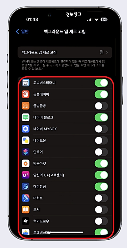 사용량이 지나치게 높으면 백그라운드 새로고침 OFF