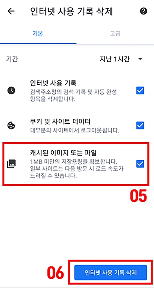 4. 캐시된 이미지·파일 선택 → 삭제