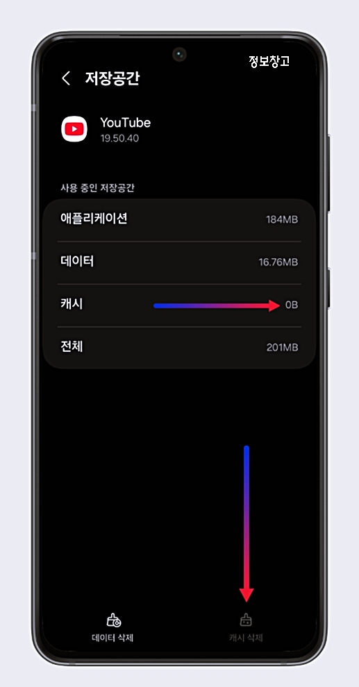 앱 캐시 메뉴로 들어가면 ‘데이터 삭제’ 버튼이 바로 옆에 있어 실수하기 쉽습니다.