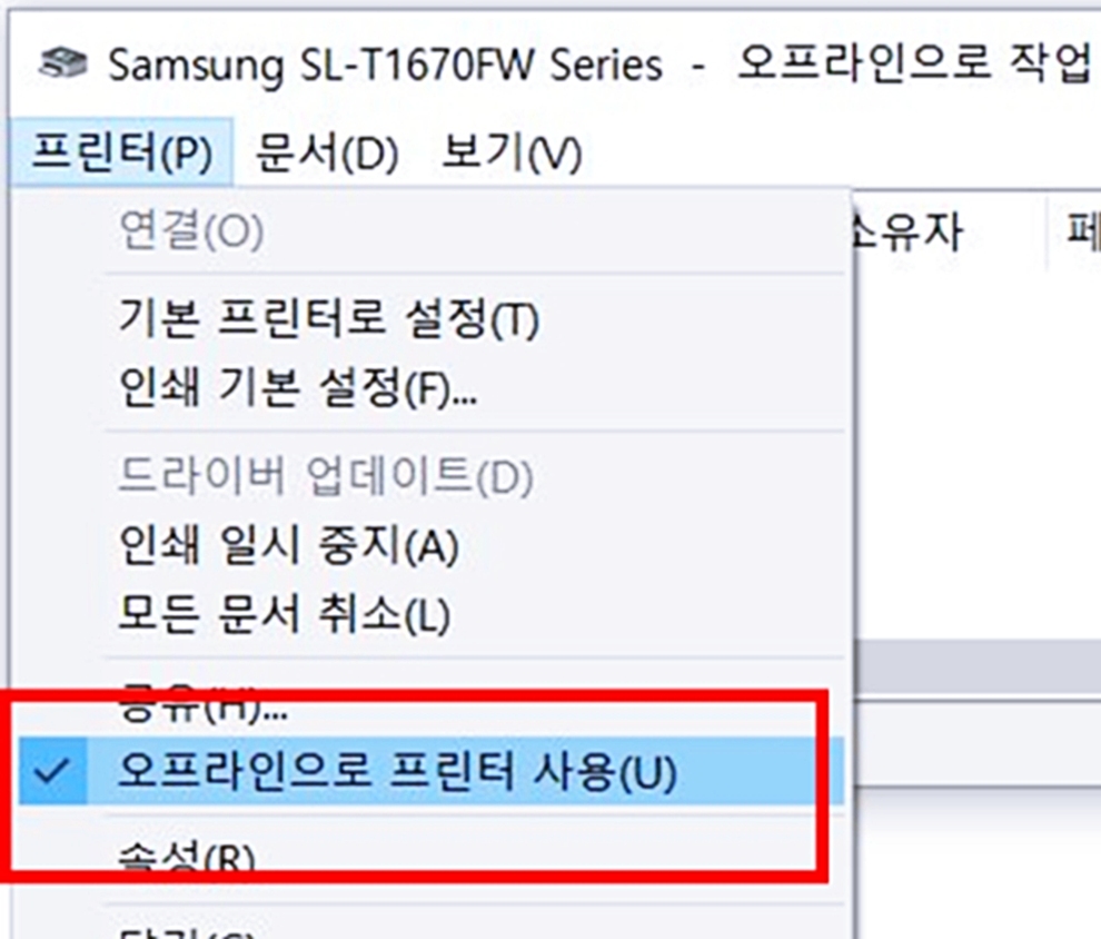 → 프린터 선택 → “프린터 오프라인 사용” 체크 해제