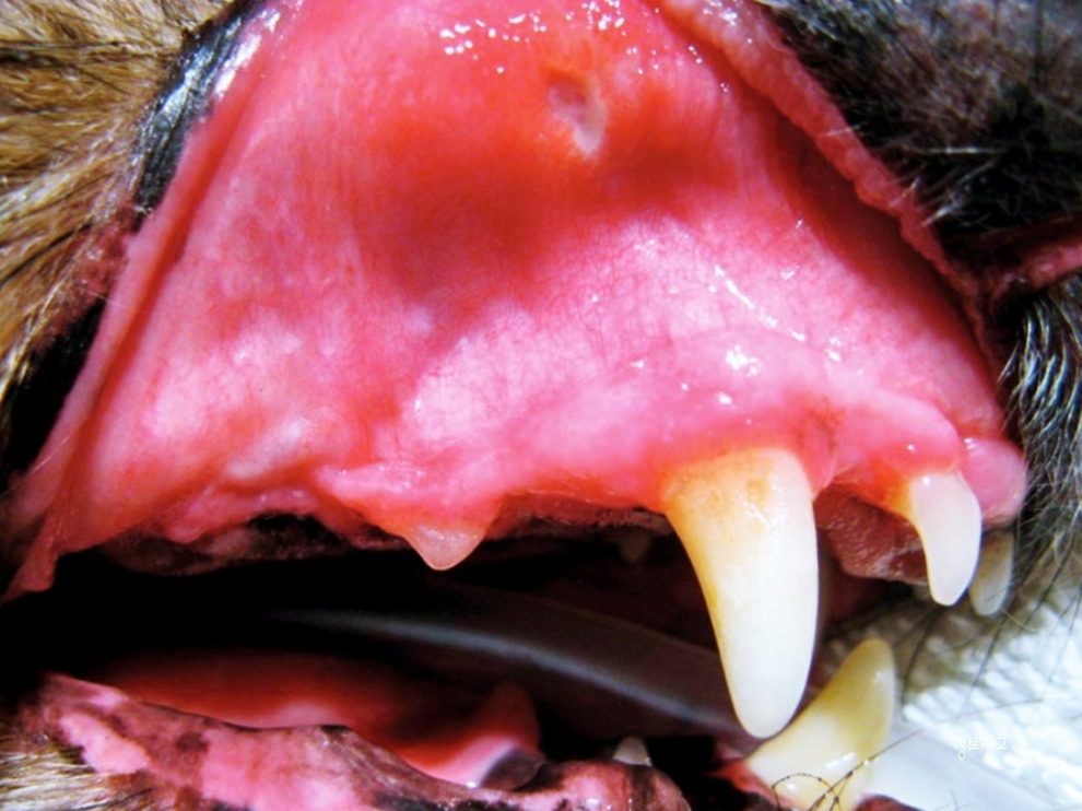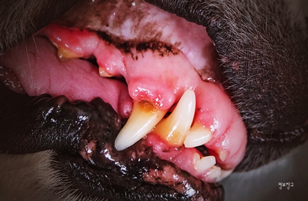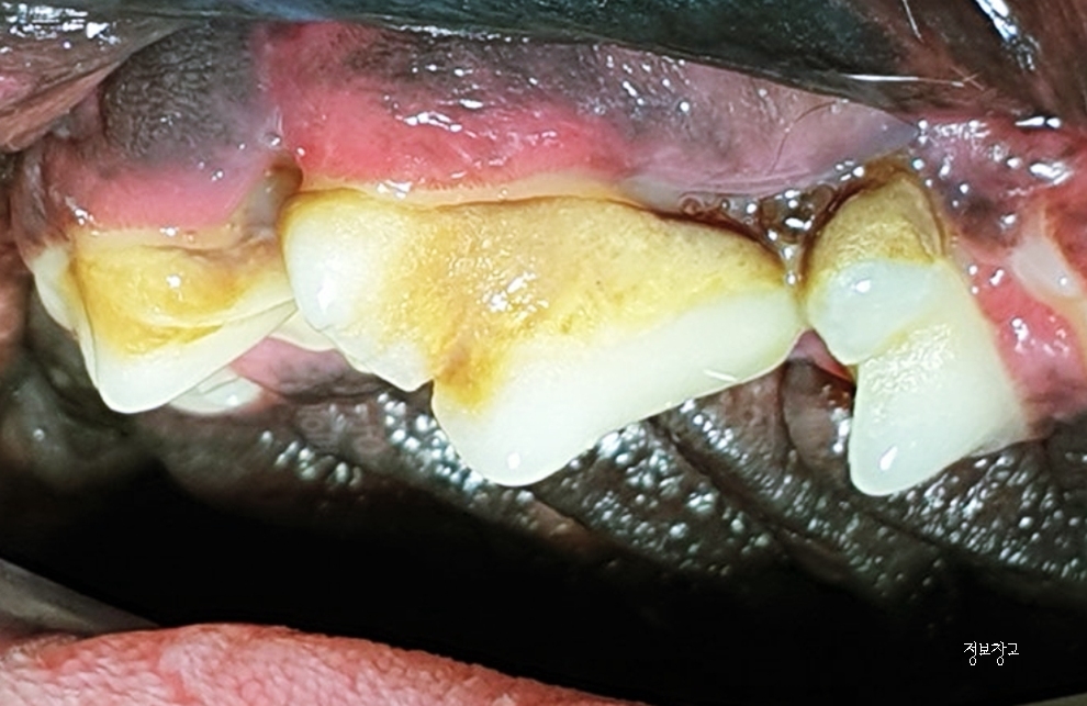 - 노란색·갈색 치석이 치아에 붙어 있음